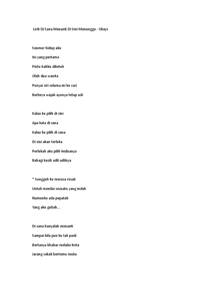 Download lagu disana menanti disini menunggu mp3 gratis 320kbps (3.43 mb). Di sana menanti di sini menunggu # seumur hidup aku ini yang pertama pintu hatiku diketuk oleh dua wanita punyai ciri selama ini ku cari berbeza wajah ayunya tetap asli kalau ku pilih di sini apa kata di sana kalau ku p… Ricko channel 2 years ago. Download lagu disana menanti disini menunggu mp3 dan video klip mp4 (3.43 mb) gudanglagu. Disana menanti disini menunggu copyright :