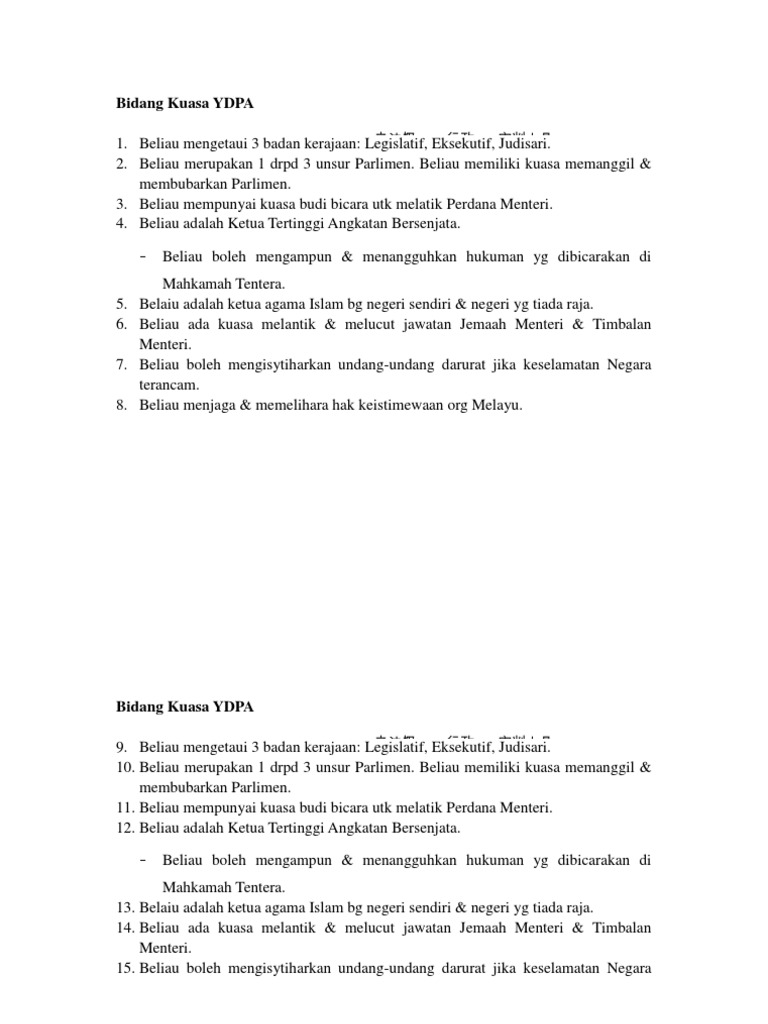 Peranan Seri Paduka Sebagai Ketua Agama from assets.bharian.com.my Ydpa ada kuasa budi bicara untuk menolak permohonan untuk bubar parlimen. Kenapa ydpa nak jumpa tunm dan dsai/dswa? Tidak mempersetujui permintaan pembubaran parlimen; Opsi biner tidak tersedia untuk trading di wilayah ini. Keadaan ini hanya menandakan tsmy sanggup hilang kuasa dan serahkan kepada kebijaksanaan ydpa demi kestabilan negara berhadapan dengan covid 19. Ydpa mengikut perkara 150 perlembagaan persekutuan boleh mengeluarkan perisytiharan darurat apabila berpuas hati bahawa suatu darurat. Di antara kuasa ydpa ialah Sejarah f5 bab 7 :