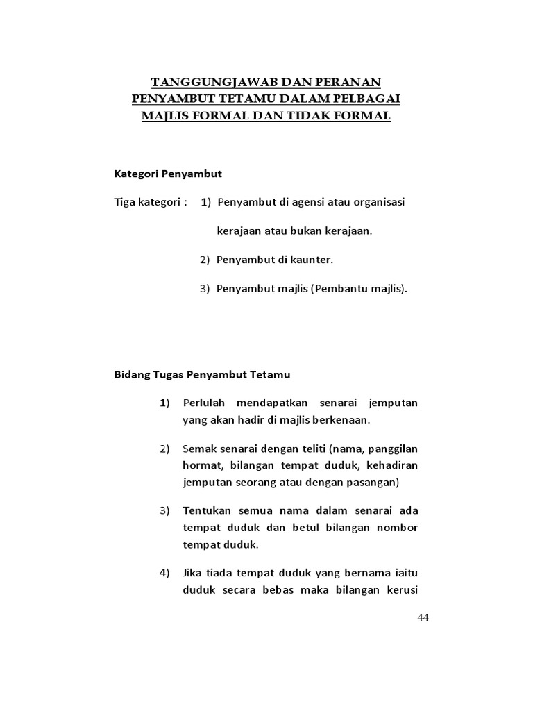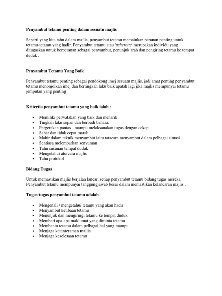 Pengurusan Majlis Dan Protokol from image.slidesharecdn.com Contextual translation of penyambut tetamu into english. If you want to learn penyambut tetamu in english, you will find the translation here, along with other translations from malay to english. Perbuatan seorang penyambut tamu di sebuah hotel lima bintang yang membuat kunci pendua bilik hotel dan merogol pelancong warga australia menerima padah. Jadi amat penting penyambut tetamu menonjolkan imej dan bertingkah laku baik. Ngiling bidai ini telah diadakan pada 30/6/2016. Need to translate penyambut tetamu from malay? Penyambut pak jokowi putra sumba. Patung penyambut tetamu stadium mbah joyo.